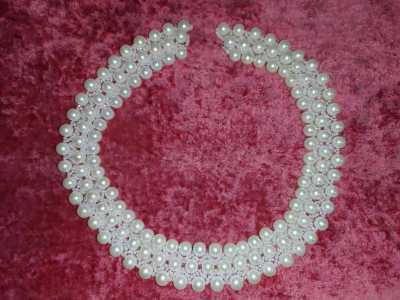 Колье выполнено из искусственного жемчуга и бисера. Жемчуг "под натуральный" (не пустотелый, ощущается тяжесть).